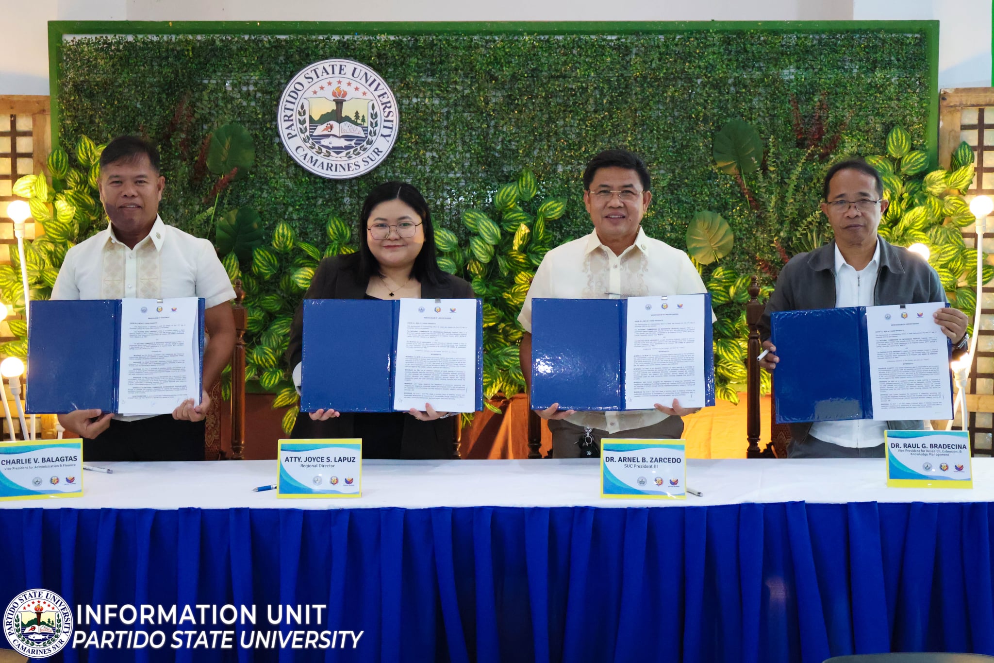 In an effort to strengthen its commitment to inclusive and community-engaged education, Partido State University (ParSU) formally signs a Memorandum of Understanding (MOU) and Memorandum of Agreement (MOA) with the National Commission on Indigenous PeoplesโRegional Office V (NCIP RO V), represented by Regional Director Atty. Joyce S. Lapuz on November 27, 2025, at the CED Review Center.ย