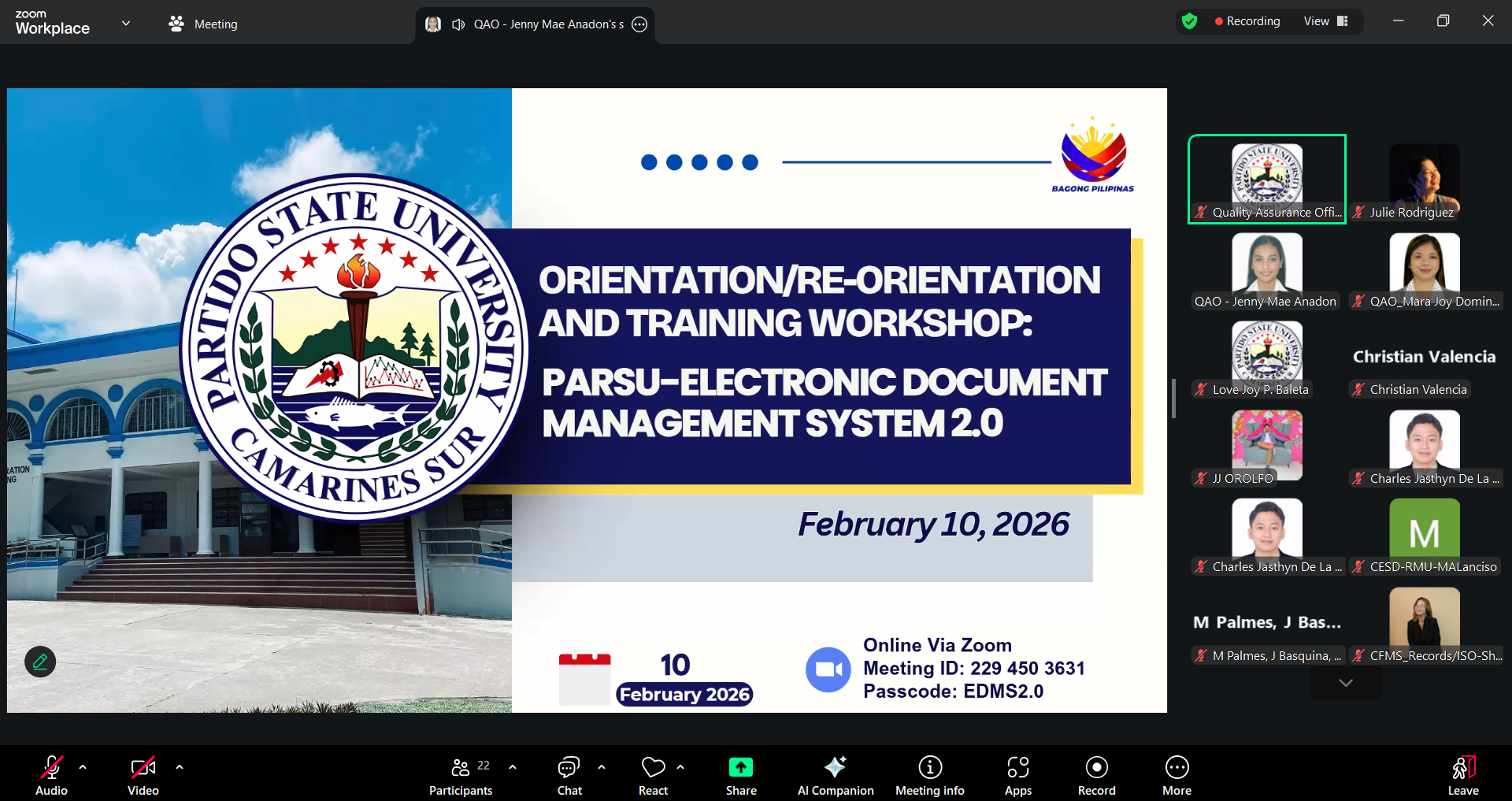 Partido State University (ParSU) through its Quality Assurance Office (QAO) successfully conducted the ๐๐ง๐ฅ๐ข๐ง๐ ๐๐ซ๐ข๐๐ง๐ญ๐๐ญ๐ข๐จ๐ง ๐๐ง๐ ๐๐ซ๐๐ข๐ง๐ข๐ง๐ ๐๐จ๐ซ๐ค๐ฌ๐ก๐จ๐ฉ ๐จ๐ง ๐ญ๐ก๐ ๐๐ฅ๐๐๐ญ๐ซ๐จ๐ง๐ข๐ ๐๐จ๐๐ฎ๐ฆ๐๐ง๐ญ ๐๐๐ง๐๐ ๐๐ฆ๐๐ง๐ญ ๐๐ฒ๐ฌ๐ญ๐๐ฆ (๐๐๐๐ ๐.๐)ย on February 10, 2026, strengthening the universityโs shift toward smarter and more efficient digital workflows.