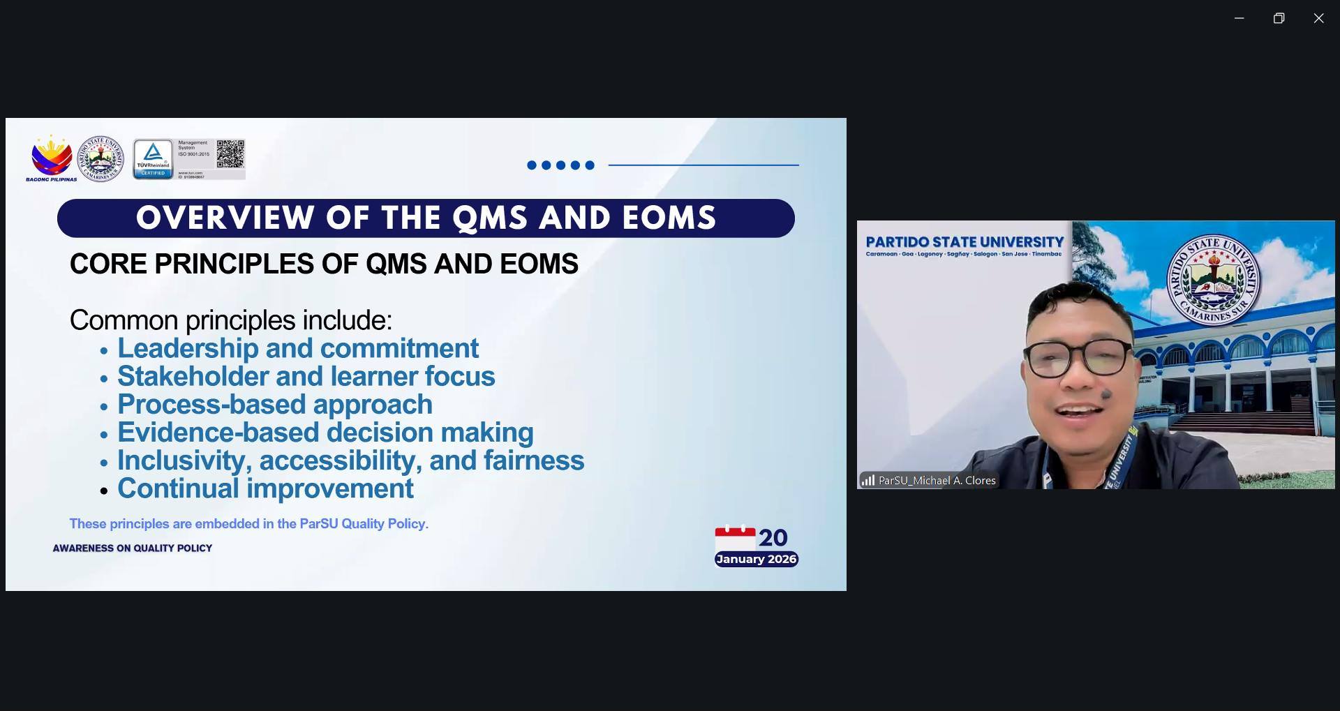 Partido State University further strengthened its culture of accountability and continuous improvement as the Quality Assurance Office (QAO) conducted an online ISO Orientation on the Quality Policy and Internal Quality Audit (IQA) on January 20, 2026.