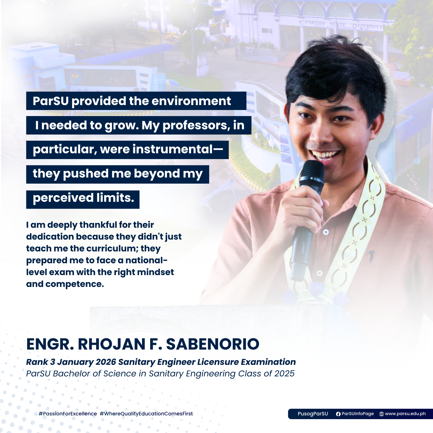 At the center of Rhojan’s development is Partido State University (ParSU), which he credits as instrumental in shaping both his competence and character.