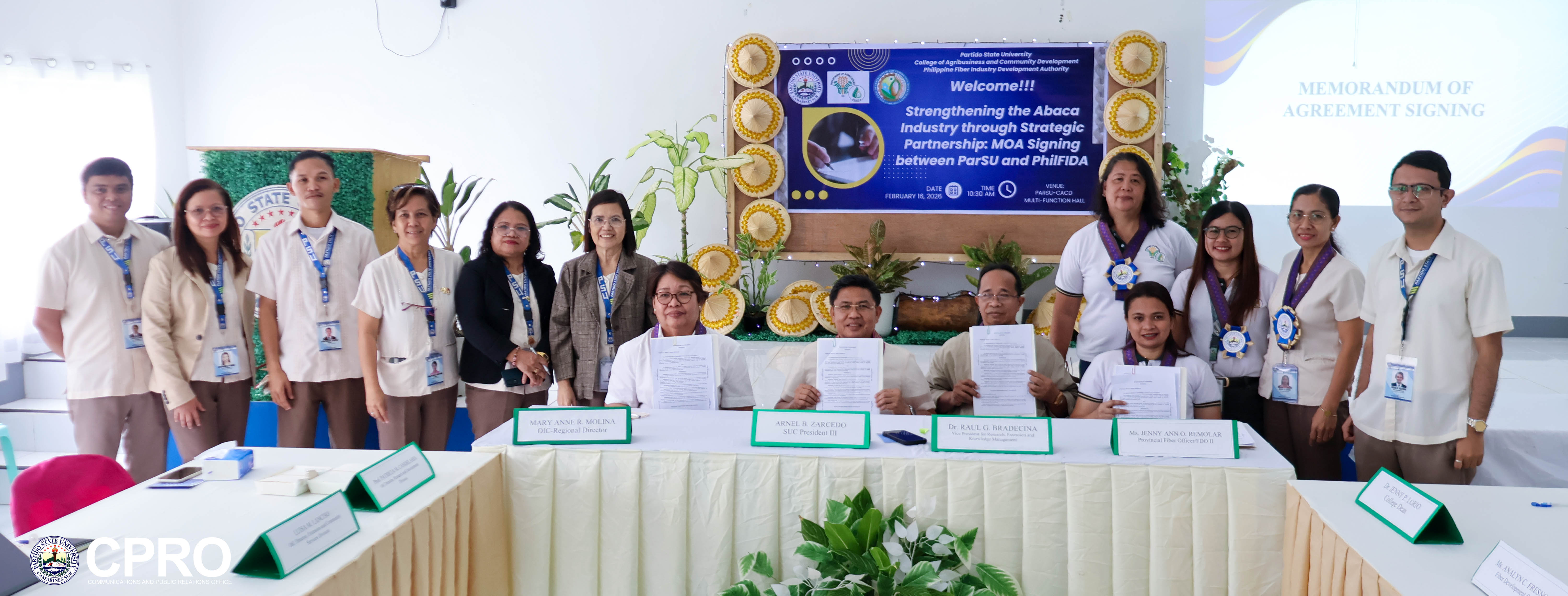 To continue the implementation of the production and distribution of Abaca planting materials, Partido State University (ParSU), through its College of Agribusiness and Community Development (CACD) Salogon Campus, renewed its partnership with the Philippine Fiber Industry Development Authority (PhilFIDA) during the "Strengthening the Abaca Industry through Strategic Partnership: Memorandum of Agreement (MOA) Signing" held on February 16, 2026, at the CACD Multi-Function Hall.