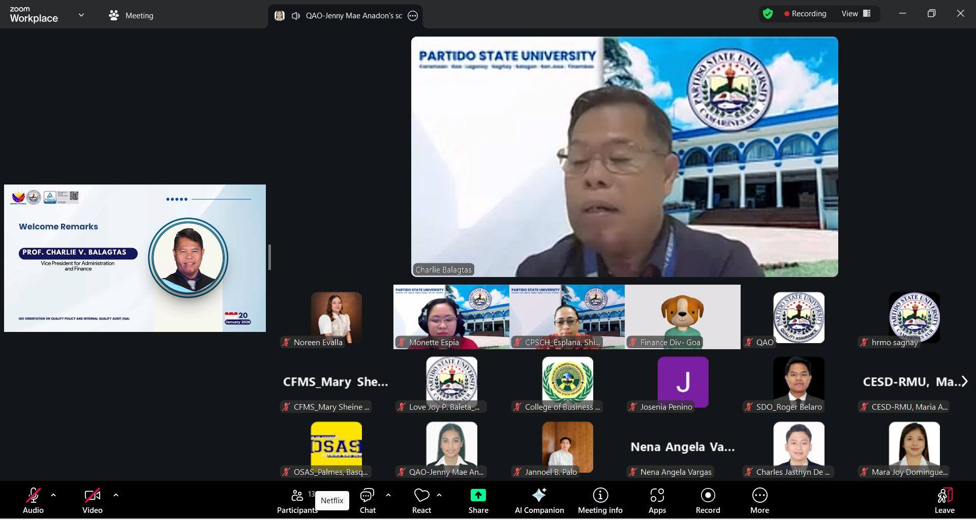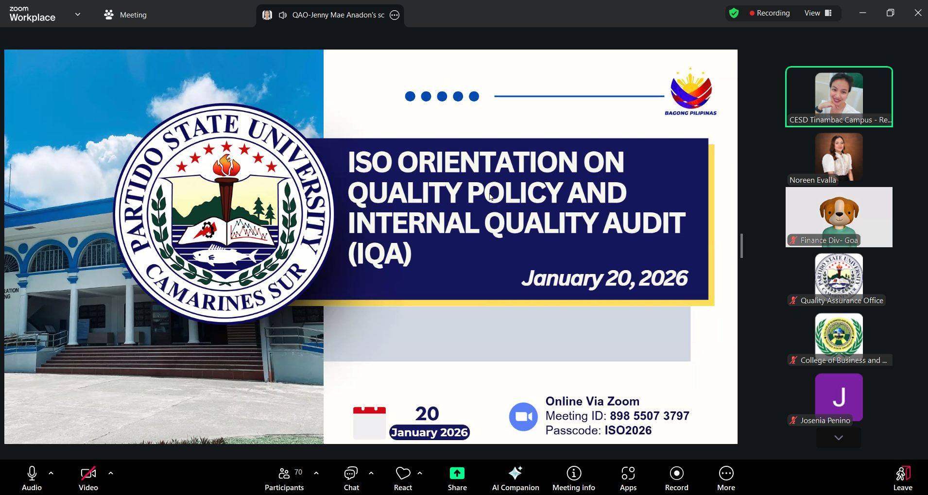 Partido State University further strengthened its culture of accountability and continuous improvement as the Quality Assurance Office (QAO) conducted an online ISO Orientation on the Quality Policy and Internal Quality Audit (IQA) on January 20, 2026.