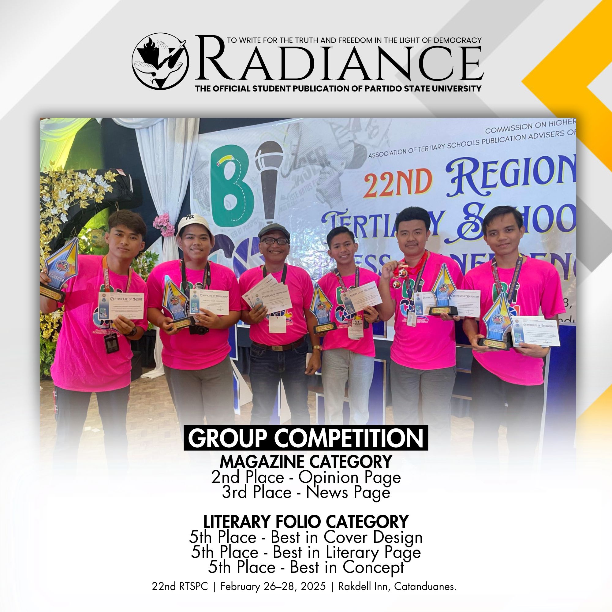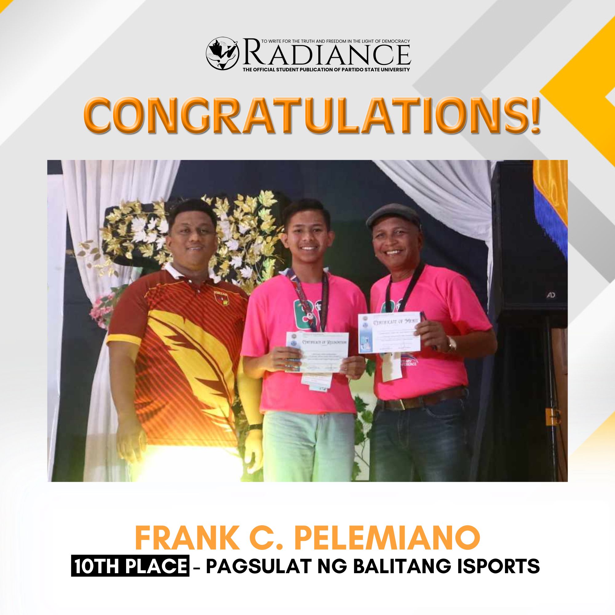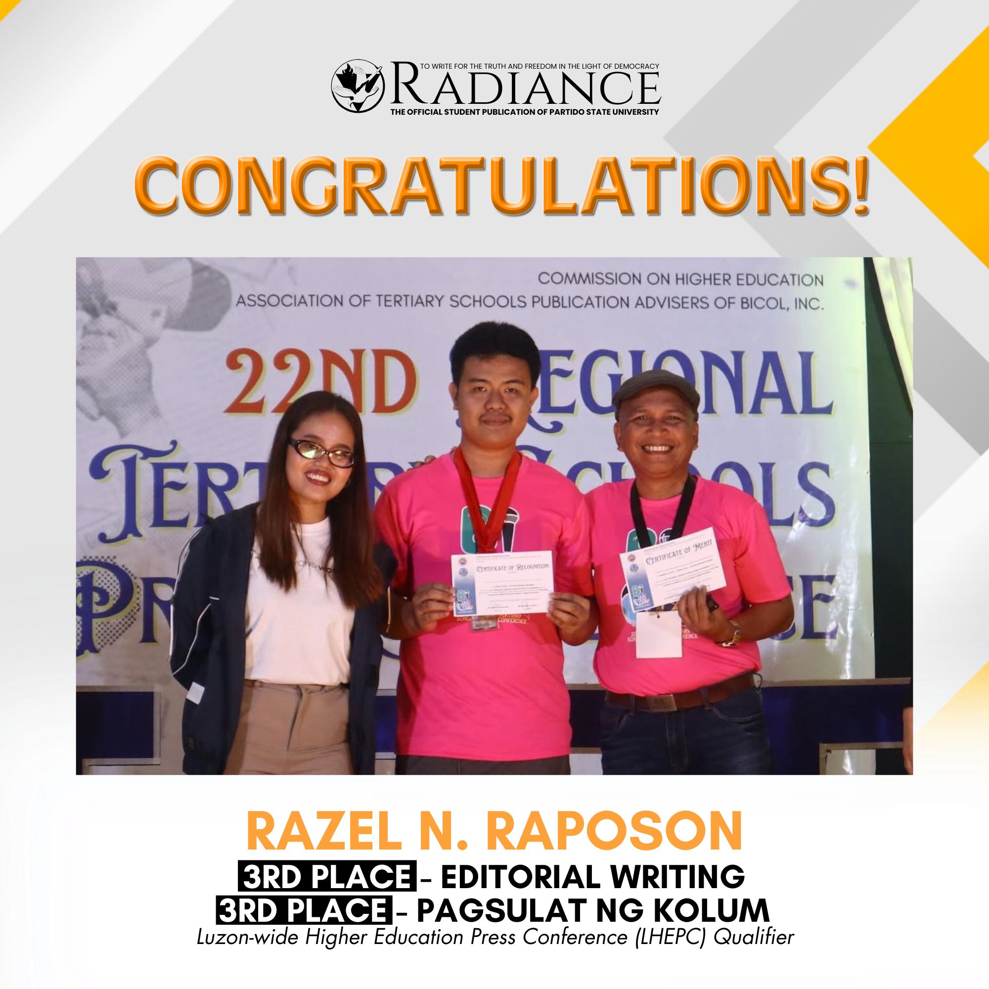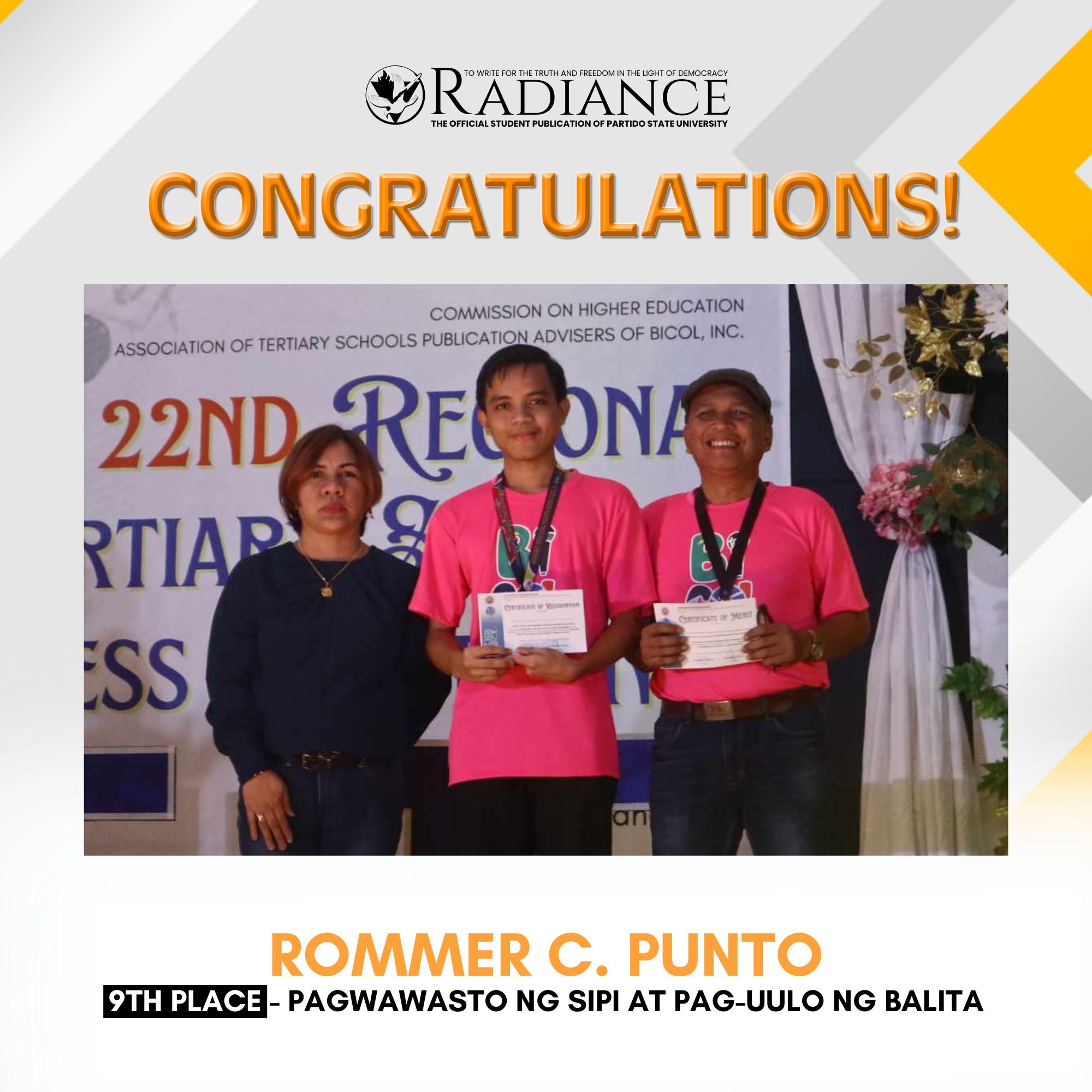 Aldrin D. Rivero, Rank 4, 2022 Certified Public Accountant Licensure Examination (CPALE). Together with another passer posting for the institution a passing rate of 66.67% above the national passing rate of 23.58%. | |